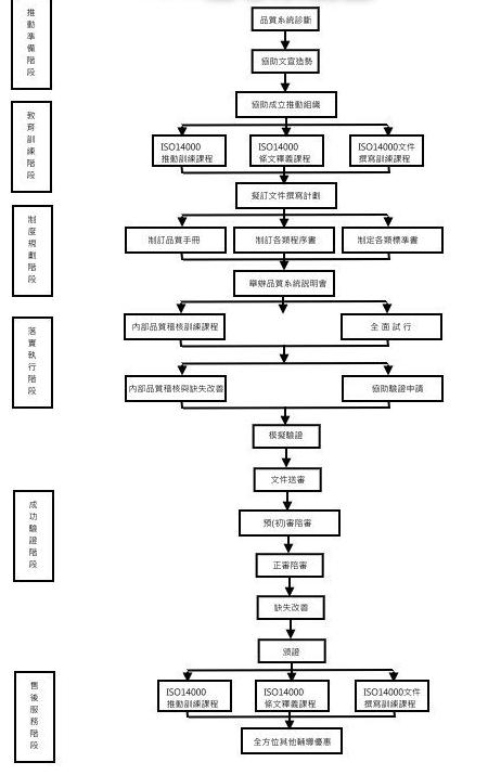 ISO 14000系列包括「環境管理系統」、「環境稽核」、「環境績效評估」、「環保標章—環境訴求與宣告」、「生命週期評估」、「用詞與定義」、「產品標準之環境考慮面指導」等七大項。其中僅1996年9月通過公告之「ISO 14001環境管理系統規範」與未來之「ISO 14024環境訴求與宣告之第一類環保標章」係分別供應為組織與產品之驗證標準,其餘之標準則係提供技術工具,指導綱要及相關工作架構。